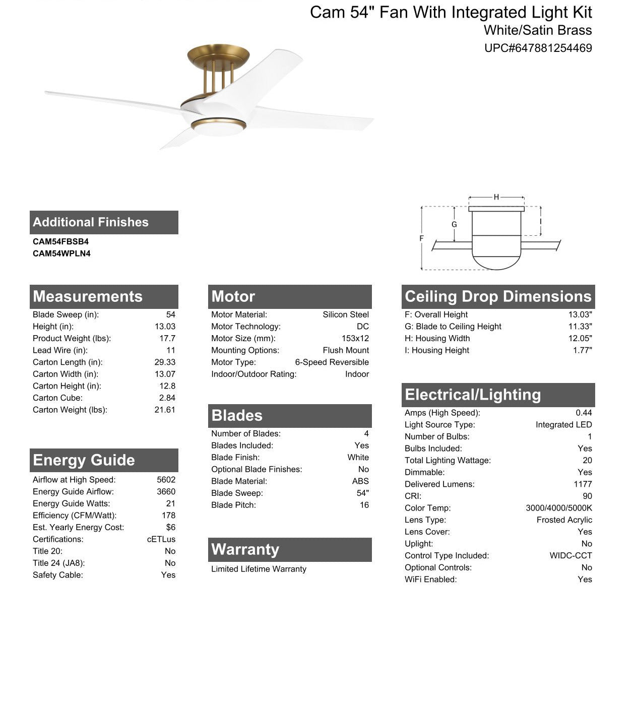 Low ceiling? No Problem! Part of our Low Ceiling Solutions Series, the Cam 54" updated flushmount ceiling fan offers smooth lines and a low-profile body with four sleek blades, an integrated 20W dimmable LED 3 CCT 3000-5000K light with optional lens cover, and is easily controlled with either the included remote control or the integrated WIFI featuring breeze and timer functions compatible for use with most smart home devices, smart phones and systems.