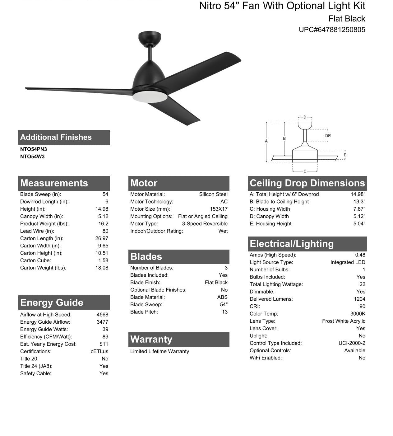 Indoor or Outdoors, the wet-rated Nitro 54" by Craftmade features custom ABS blades, an optional 22W dimmable LED Light with an optional lens cover, and a standard, 3-speed reversible motor with wall and remote controls to deliver airflow performance wrapped in sleek modern style.