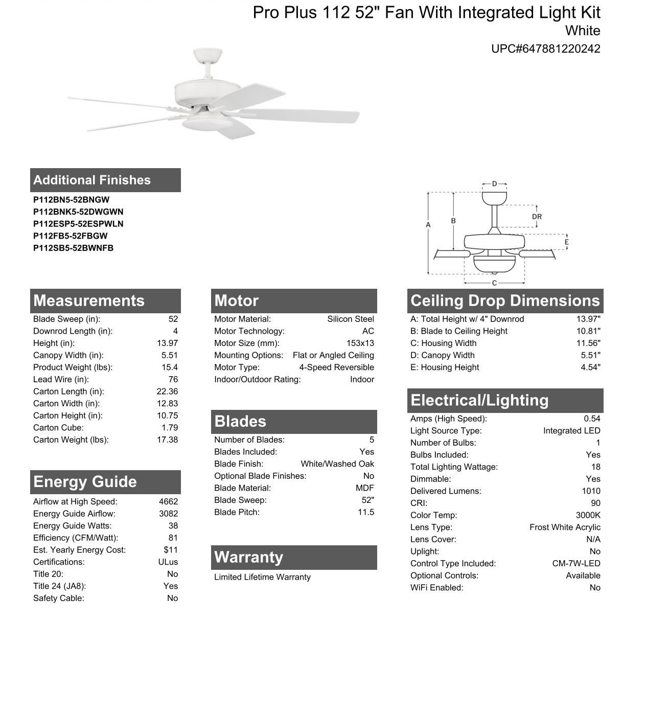 The ideal combination of excellent performance, exceptional value and timeless style, the Craftmade Pro Plus 52" ceiling fan with integrated dimmable LED light with wall control included featuring a clean motor, updated straight blade arms and canopy is built for performance. The dual mount, 3-speed, reversible fan includes custom 52" reversible blades.