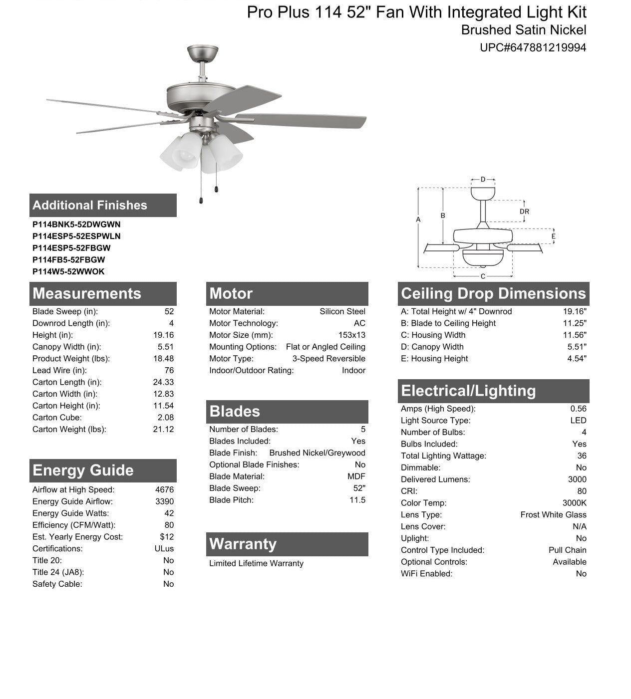 The ideal combination of excellent performance, exceptional value and timeless style, the Craftmade Pro Plus 52" ceiling fan with white frost glass four light with non-dimmable LED bulbs included featuring a clean motor, updated straight blade arms and canopy is built for performance. The dual mount, 3-speed, reversible fan includes custom 52" reversible blades. Optional remote controls are available(Sold Separately).