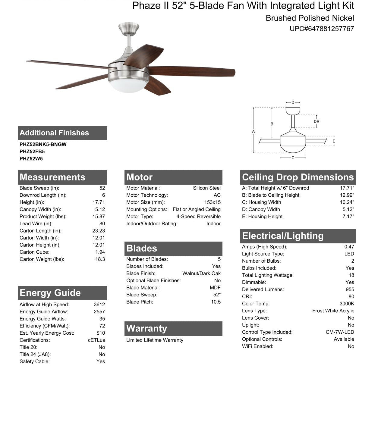 52" Phaze II 5-Blade in Brushed Polished Nickel w/ Walnut/Dark Oak Blades