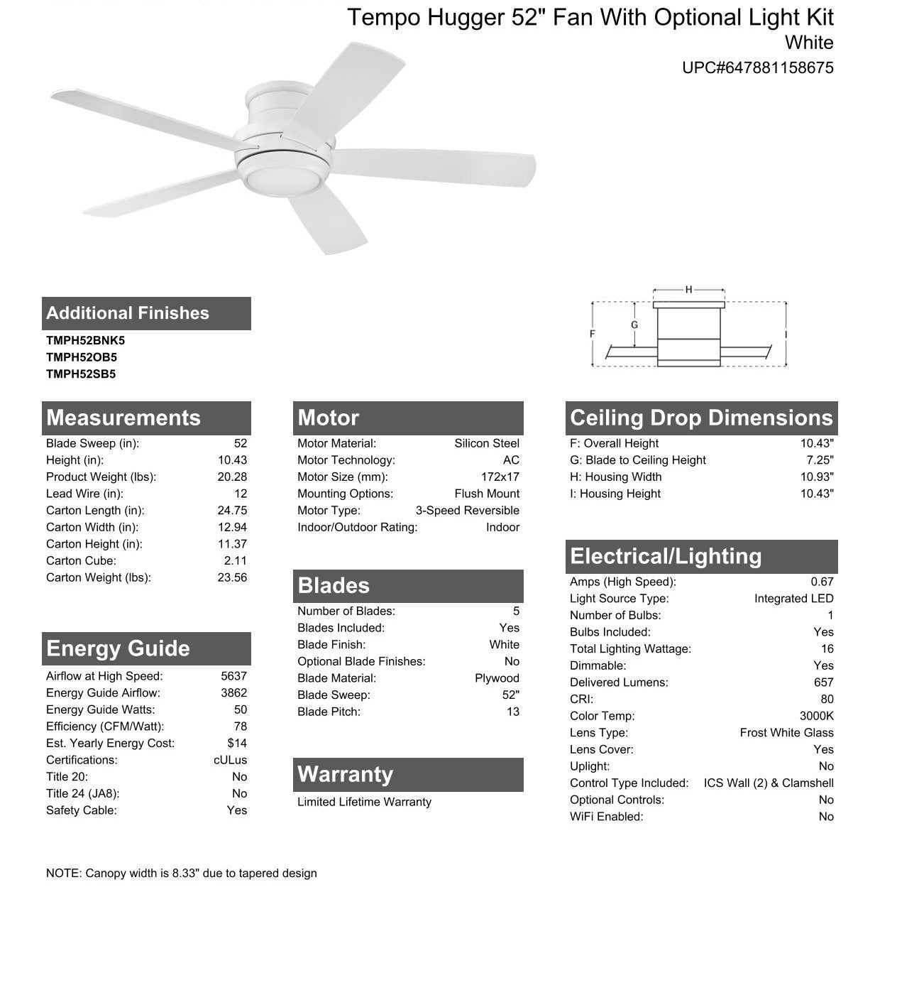 - Custom Reversible Tempo Hugger 52" Blades Included White