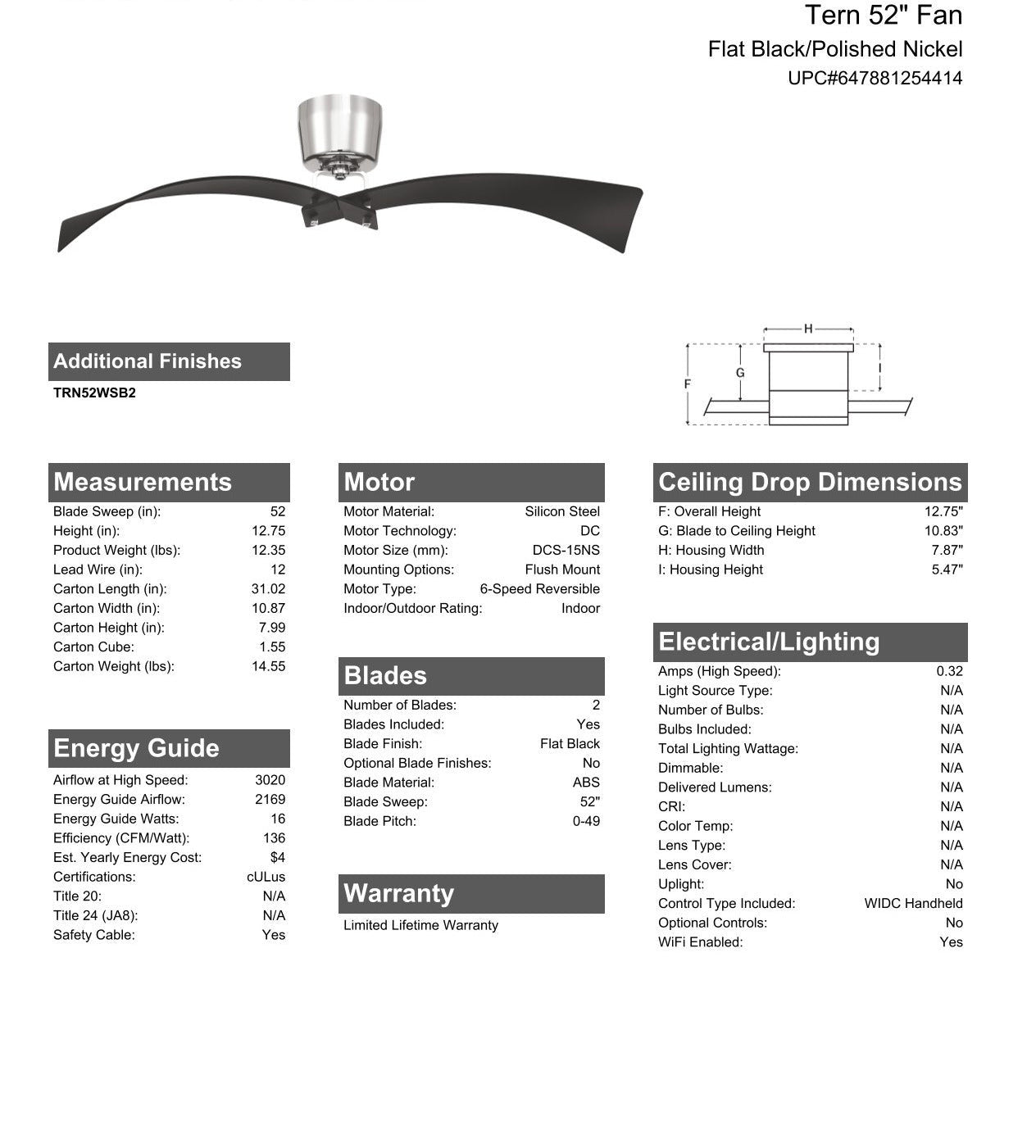 Soar into high style with the Tern 52" ceiling fan featuring two interlocked curved ABS blades suspended from an sleek tapered canister enhanced with the convenience of a Wi-Fi enabled, energy saving, 6-speed reversible DC motor that can controlled using the included handheld remote control or through the integrated Wi-Fi feature using the Bond app which allow access to additional functions including voice control, breeze, and timer functions compatible for use with most smart home devices, smartphones, and systems with no additional hub needed. Not light kit adaptable.
