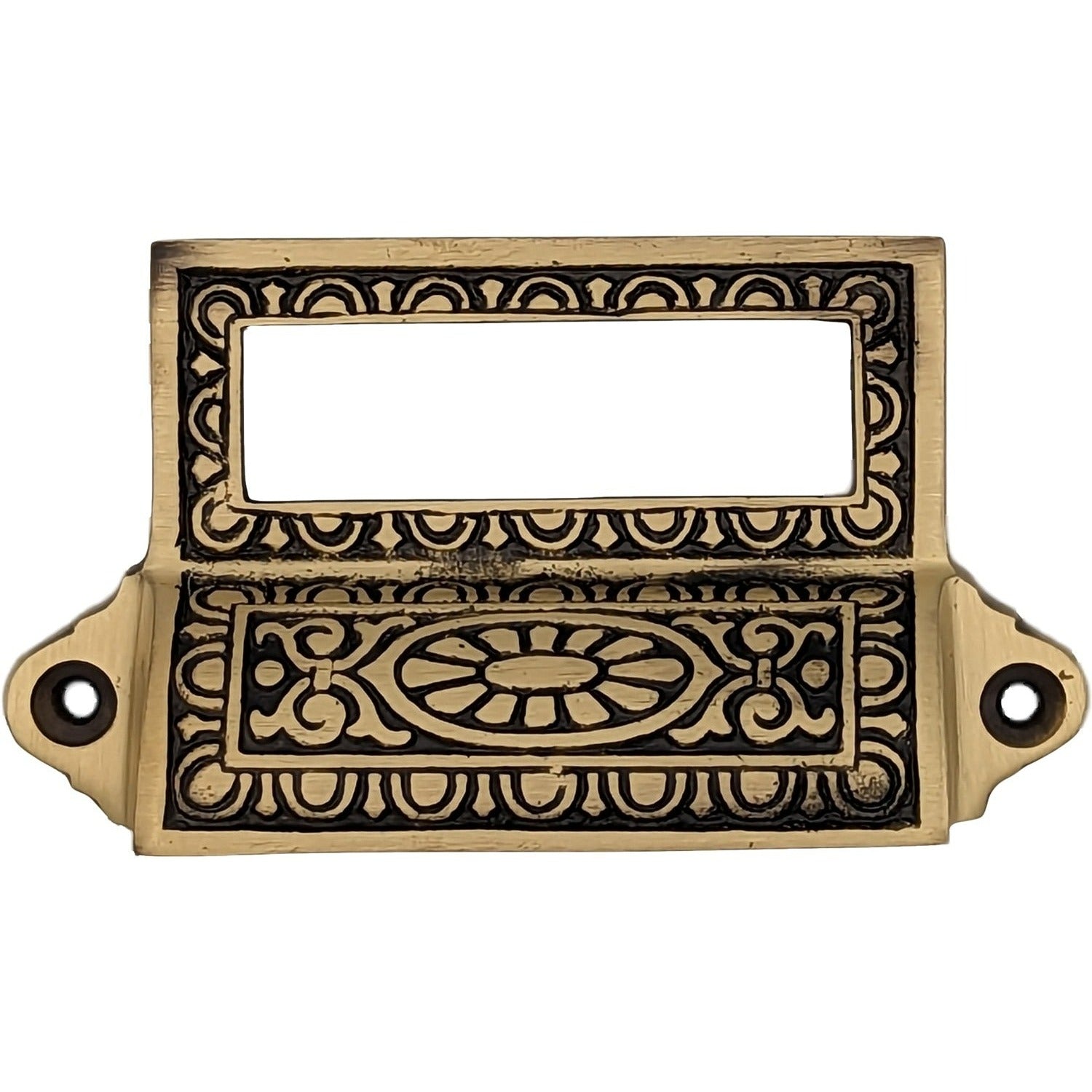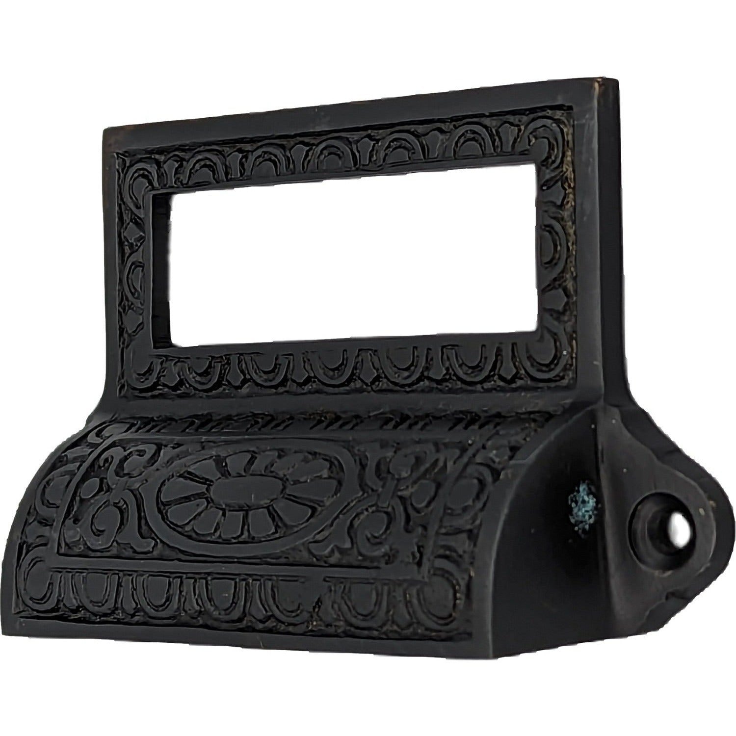 Measures 4 1/8 inches long and 2 1/4 inches tall. Has a place on top to put drawer labels. Center to center spacing measures 3 1/2 inches (88.9 mm 3.50 c-c). Hand cast and hand finished piece with highly ornate detailing.