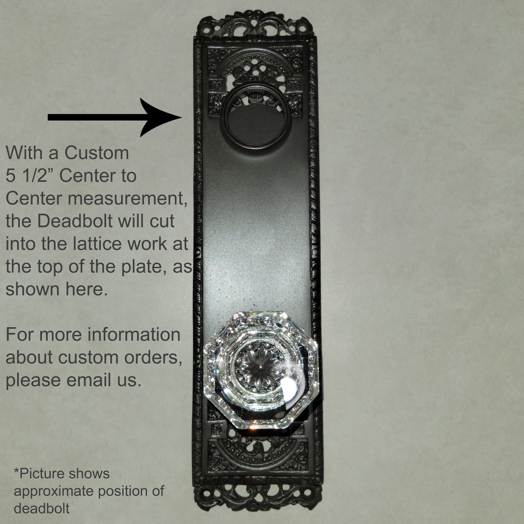 This entryway set is made from solid brass and measures 2 1/2 inch wide by 12 inch tall. Shown with the round brass knob. Other styles of knobs available at no additional charge. Entryway set deadbolt to knob center-to-center distance is 3 inches - other center-to-center distances are available upon request. Entryway backset comes as 2 3/8 inch standard and a 2 3/4 inch backset is available at no additional charge.