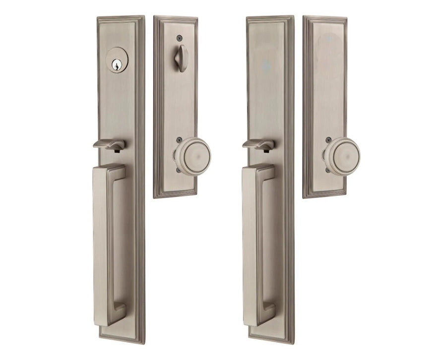Solid Brass Melrose Style Entryway Set (Brushed Nickel Finish) - this entryway set measures 3 inch wide by 18 1/2 inch tall. Various styles of knobs available at no additional charge. Entryway set deadbolt to knob center-to-center distance is 5 1/2 inches. Entryway backset comes as 2 3/8 inch standard and a 2 3/4 inch backset is available if required. The overall grip thickness is 2 5/8 inch. The clearance between the door and grip is 1 3/8 inches. The plates have a thickness of 1/2 inch. This is a complete set and it comes with tubular latch mechanisms, strike plates, complete knob sets, internal mechanisms, deadbolts and all mounting hardware.