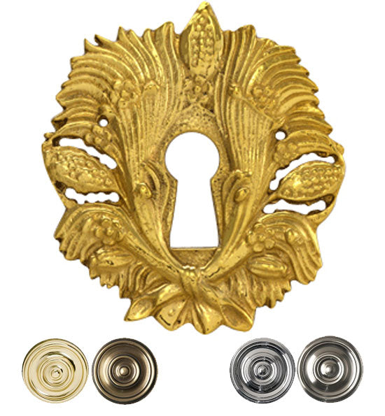 The Harvest Key Hole Cover measures 2 1/4 inch by 2 1/2 inch tall. The key hole measures 3/8 inch wide at it's widest point. Each piece is constructed from solid brass and finished by hand. Available in several finishes including Polished Brass, Antique Brass, Polished Chrome, and Satin Nickel. The average lead time for this particular product is 1 to 2 Business Days.
