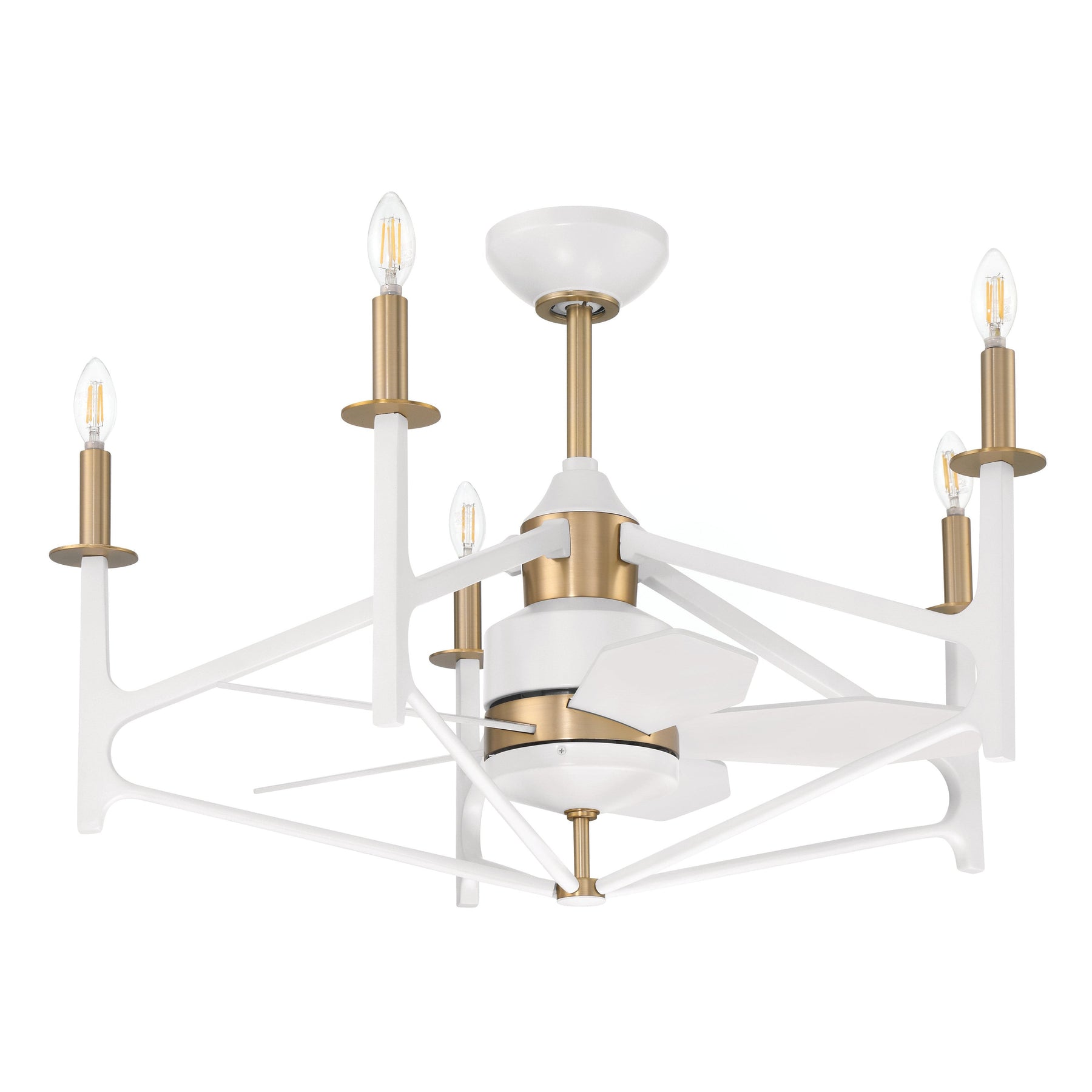 The Reserve 32" Fandelier by Craftmade combines the unique caged detail of our 5 Light chandelier from our lighting collection and the convenience a Wi-Fi enabled, energy saving, 6-speed reversible DC motor ceiling fan. Featuring 5 x 4W dimmable LED bulbs(included) and a set of three custom 24" polycarbonate blades, the fandelier can be controlled using the included handheld remote control or through the integrated Wi-Fi feature using the Bond app which allow access to additional functions including voice control, breeze, and timer functions compatible for use with most smart home devices, smartphones, and systems with no additional hub needed.
