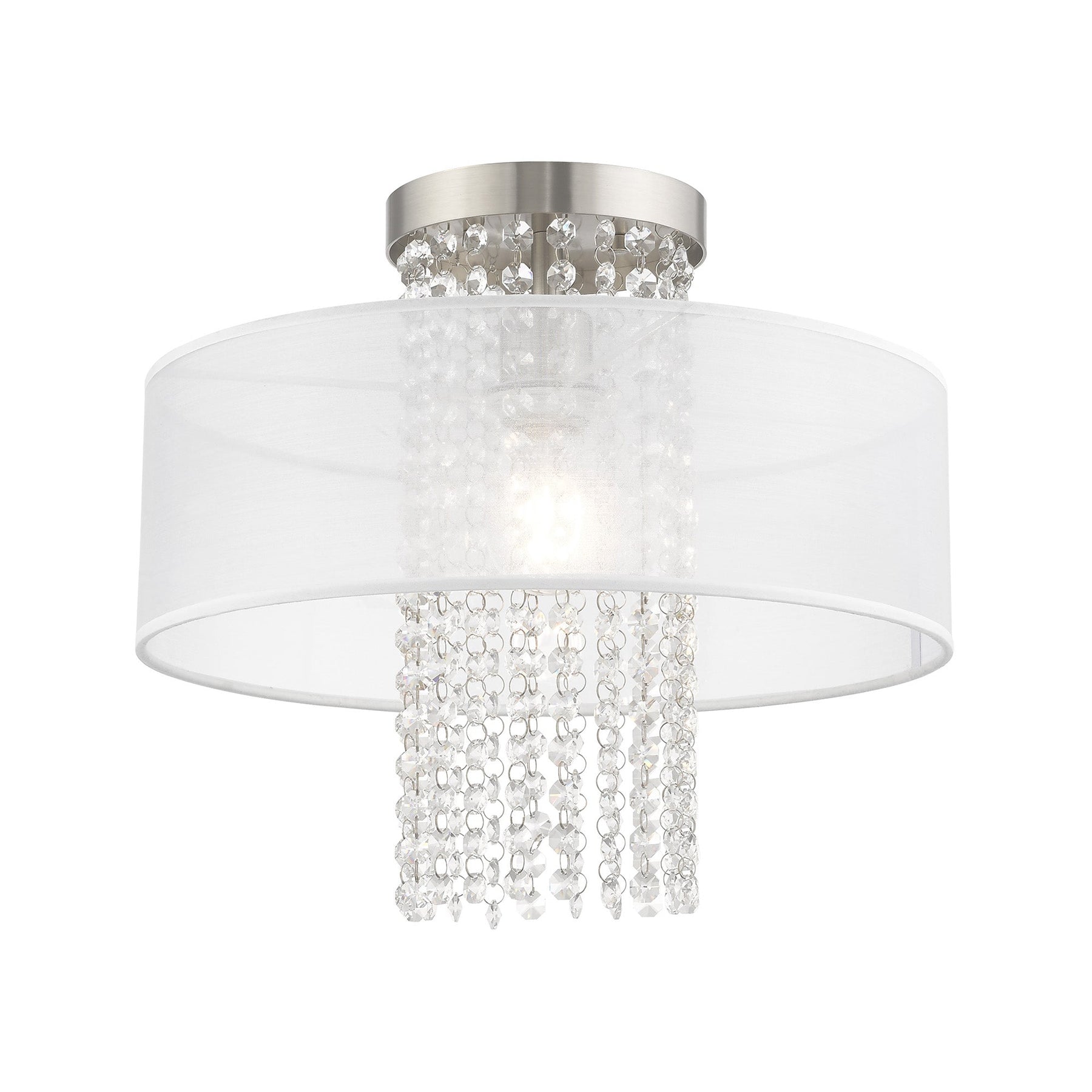 The Bella Vista Semi-Flush Fixture in Brushed Nickel is an elegant lighting option that combines modern design with timeless sophistication. Measuring 13.5 inches in height and featuring a diameter of 15 inches, this fixture showcases a hand-crafted translucent fabric shade adorned with clear crystal strands that cascade in a stunning waterfall effect. Designed to accommodate one medium base bulb (not included) with a maximum wattage of 60W, it is suitable for damp locations, making it perfect for areas like bathrooms. With its New Traditional and glamorous style, the Bella Vista is ideal for adding a sparkling touch to any room.