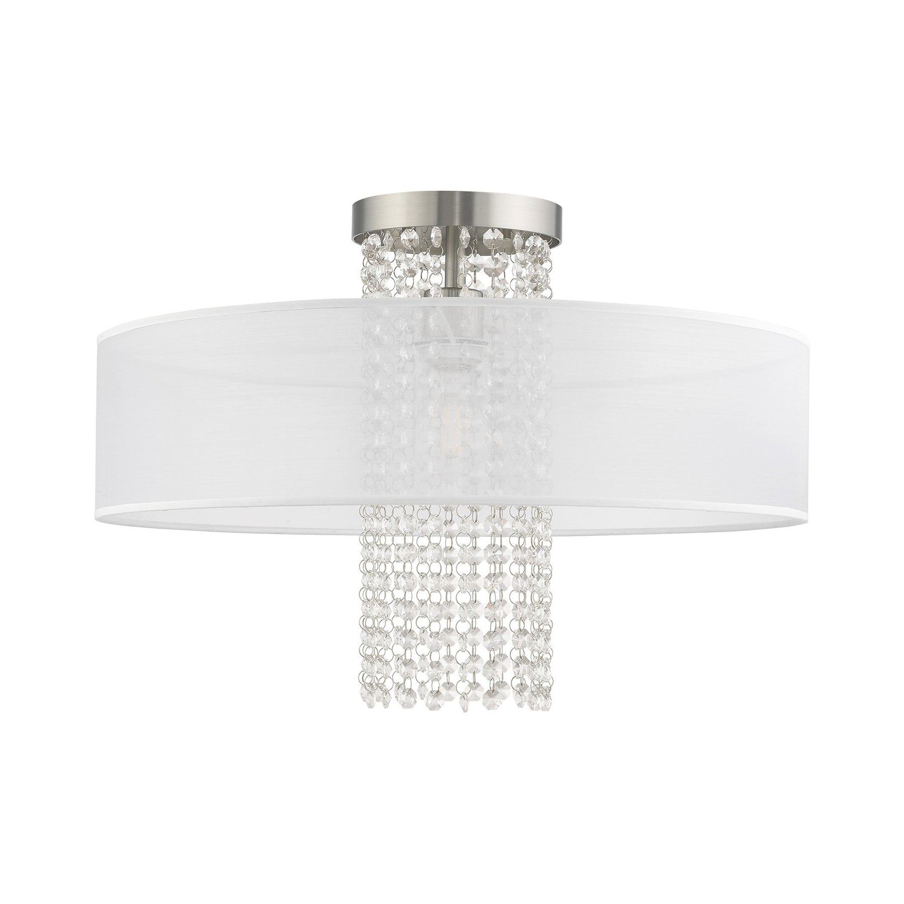The Bella Vista 41127-91 Semi-Flush light fixture is a stunning addition to any space, featuring a handcrafted translucent fabric shade complemented by a brushed nickel finish and dazzling clear crystal strands that cascade in a waterfall effect. This elegant fixture has a height of 14.5 inches and a diameter of 20 inches, and it requires a single medium base bulb with a maximum wattage of 100W (bulb not included). Designed in a New Traditional style that embodies sparkling, timeless, and glamorous elements, it is suitable for damp locations, making it a versatile choice for various settings.