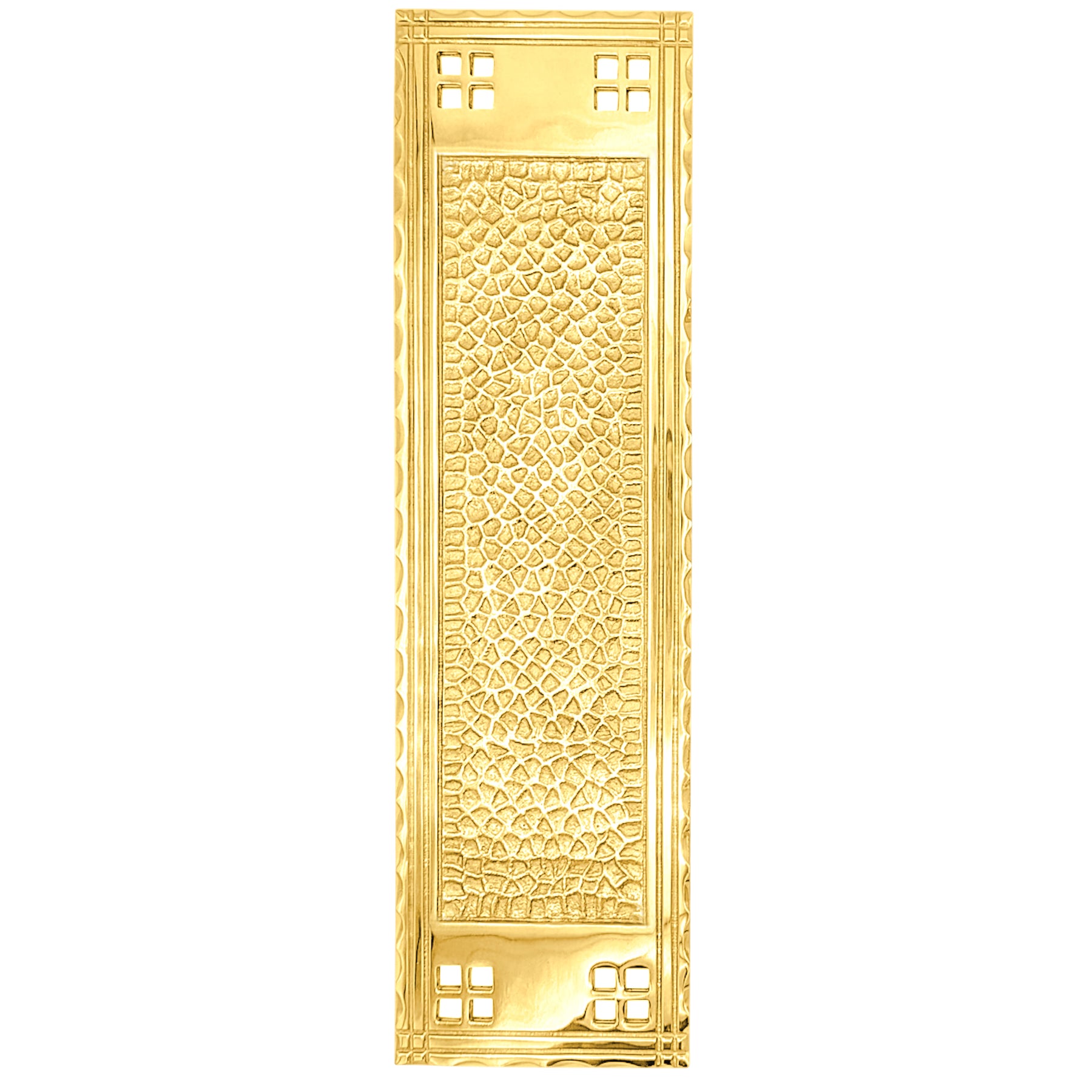 This push plate measures 12 inch tall and 3 3/8 inch wide. Craftsman style construction for decades of service. Comes complete with mounting hardware. Matching door pull also available (sold separately or as a set).