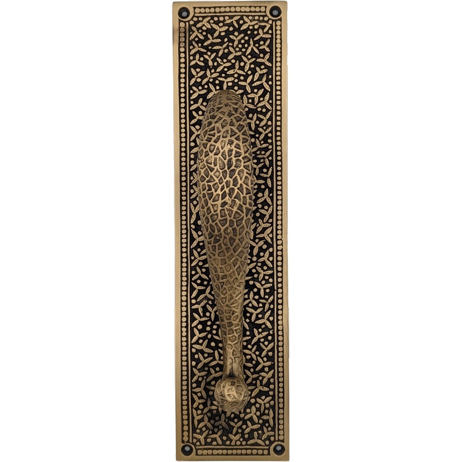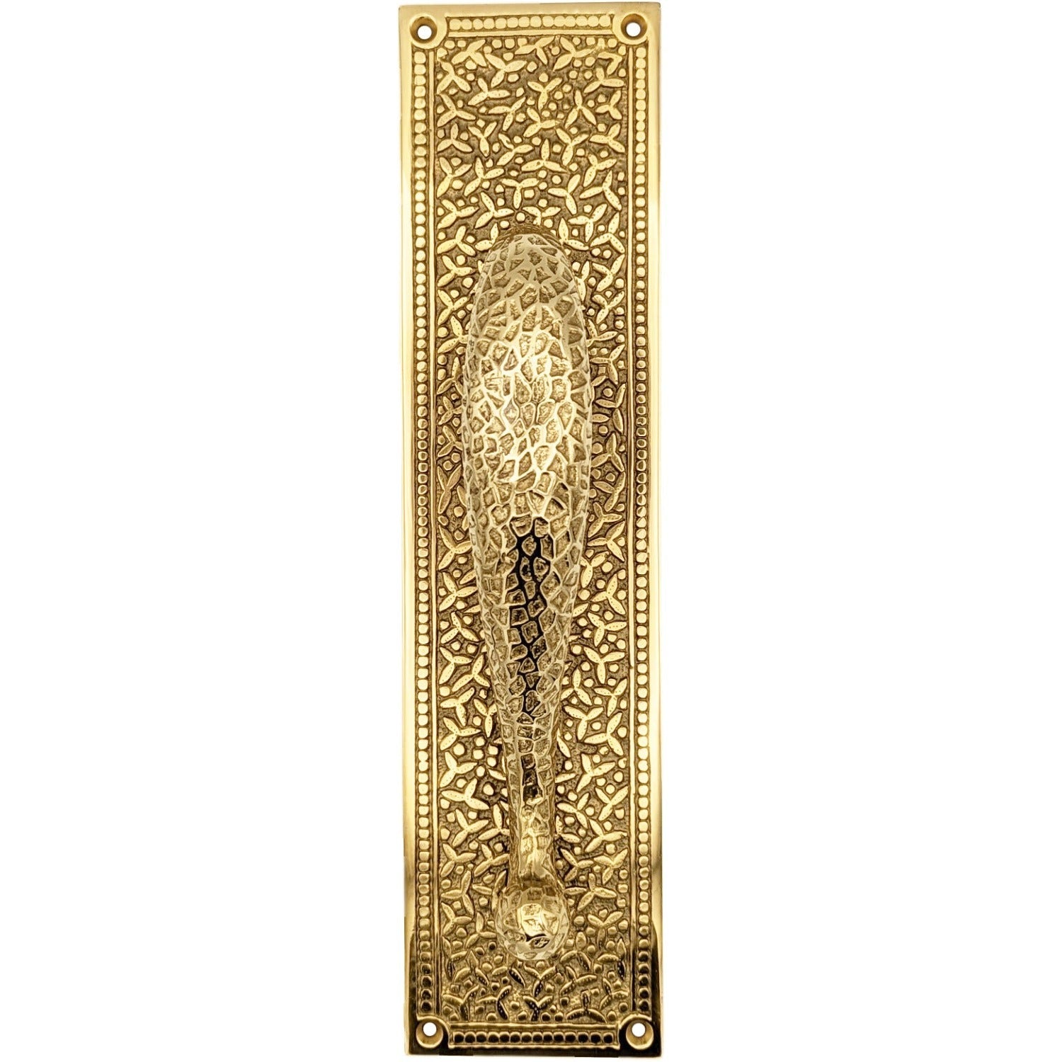 Plate measures 12 inch tall and 3 inch wide. Craftsman Pull is heavy and measures 8 1/4 inch long with a projection of 2 1/8 inch. Center to center mounting distance is approximately 6 1/2 inch (6.50 c-c). This same Craftsman style pull is available in larger 10 1/4 inch and 12 1/4 inch sizes. Solid brass construction allows for decades of service. This product comes as an unlacquered natural brass and it will patina over time. A high strength lacquer coating is available upon request. Comes complete with mounting hardware. Available in a wonderful polished brass finish.