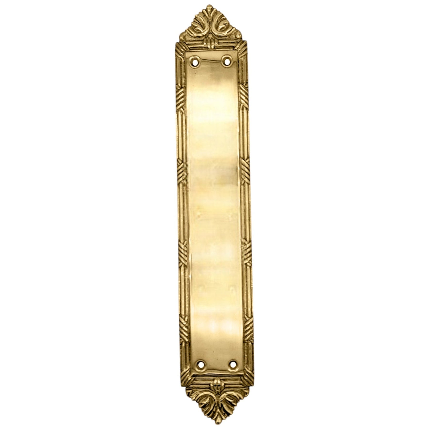 This solid brass push plate measures 2 1/2 inches by 13 3/4 inches. Features an ornate Ribbon & Reed design. Highly ornate hand cast design. Available in Polished Brass, Lacquered Brass, Antique Brass, Polished Chrome, and Satin Nickel.