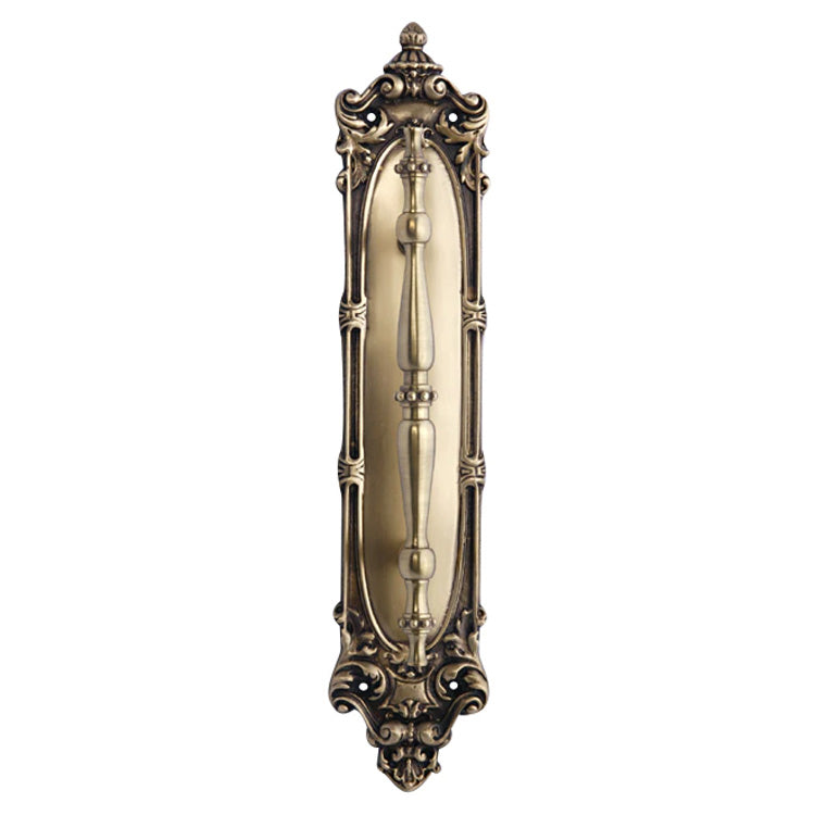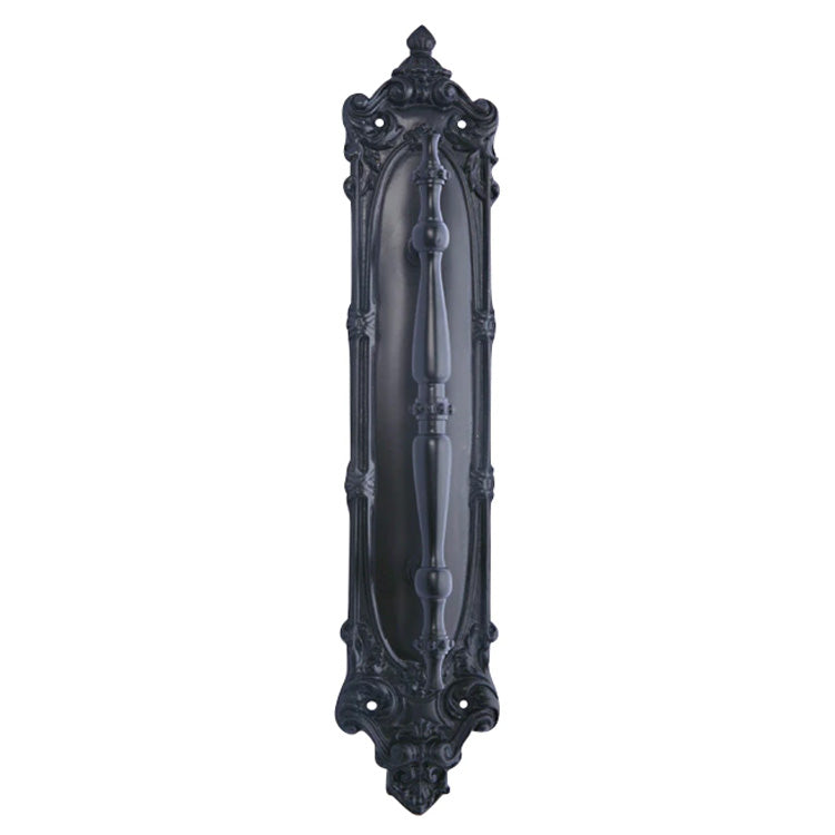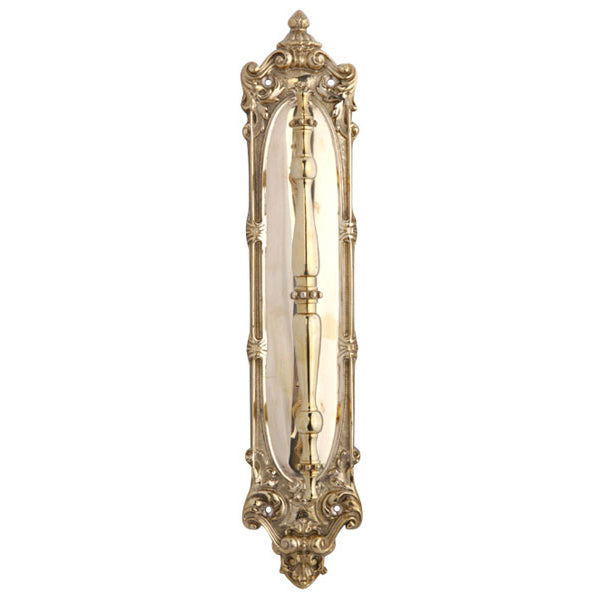 The gorgeous pull plate shown here is Victorian in style. This plate measures approximately 14 1/2 inches tall and 3 inches wide. The pull measures approximately 9 3/4 inches long and has a projection of 2 1/4 inches. Hand cast and available in three custom finishes including Polished Brass, Antique Brass, and Oil Rubbed Bronze. Comes complete with mounting hardware. This particular product has a lead time f 2 to 4 business days.
