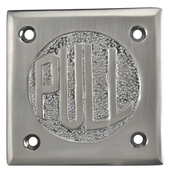 The plate measures 2 3/4 Inches on all sides and is approximately 1/8 of an inch thick. Mounting hardware is included. This product comes as an unlacquered natural brass and it will patina over time. A high strength lacquer coating is available upon request. Available in a number of finishes including, antique brass, polished brass (shown), Black Bronze, polished chrome. A "PUSH" variation is also available.