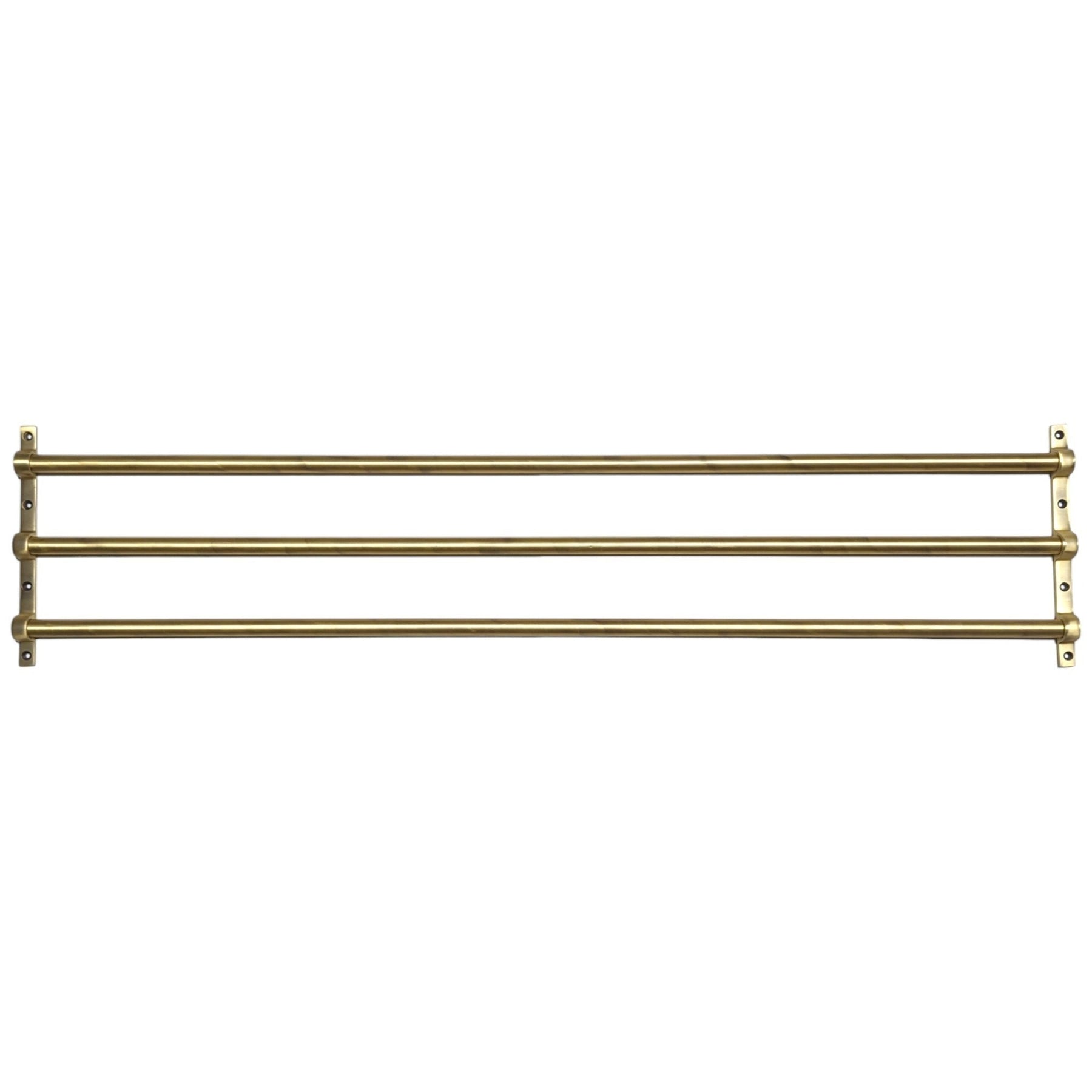 This triple push bar is finished in polished brass and is made from solid brass material. Measures approximately 37 inches overall (including brackets). Each tube is made from solid brass material and measures 36 inches long and 5/8 inch in diameter.