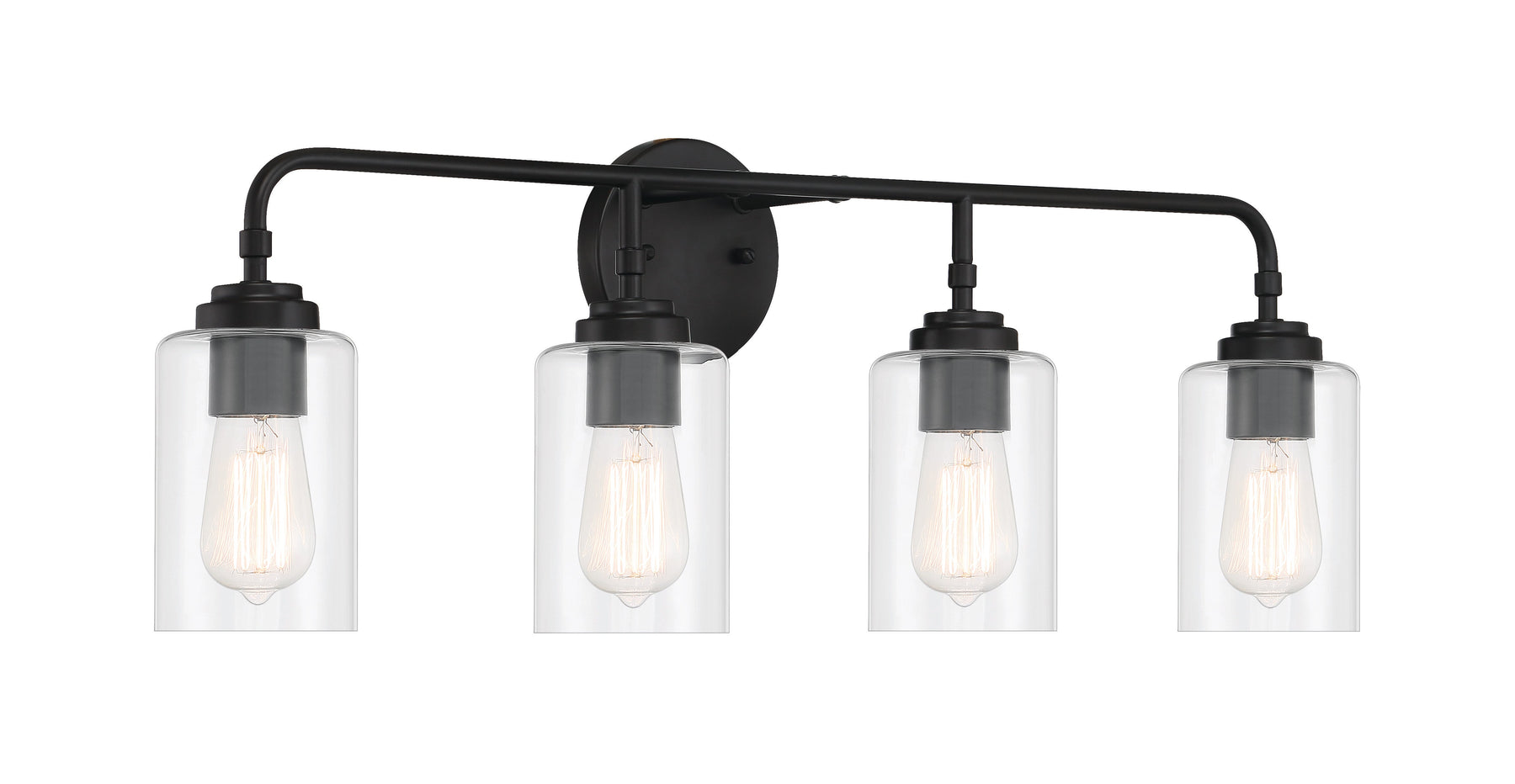 The Stowe 4 Light Vanity in Flat Black combines stylish design with functional lighting, making it a perfect addition to your bathroom. This elegant vanity fixture requires four medium base A19 bulbs with a maximum wattage of 60W each (bulbs not included). With dimensions of 31.13 inches in width, 31.13 inches in depth, and 10.75 inches in height, this wall-mounted light is damp rated, ensuring it's suitable for humid environments. The clear glass shades enhance the overall aesthetic, while the flat black finish provides a modern touch to any decor.