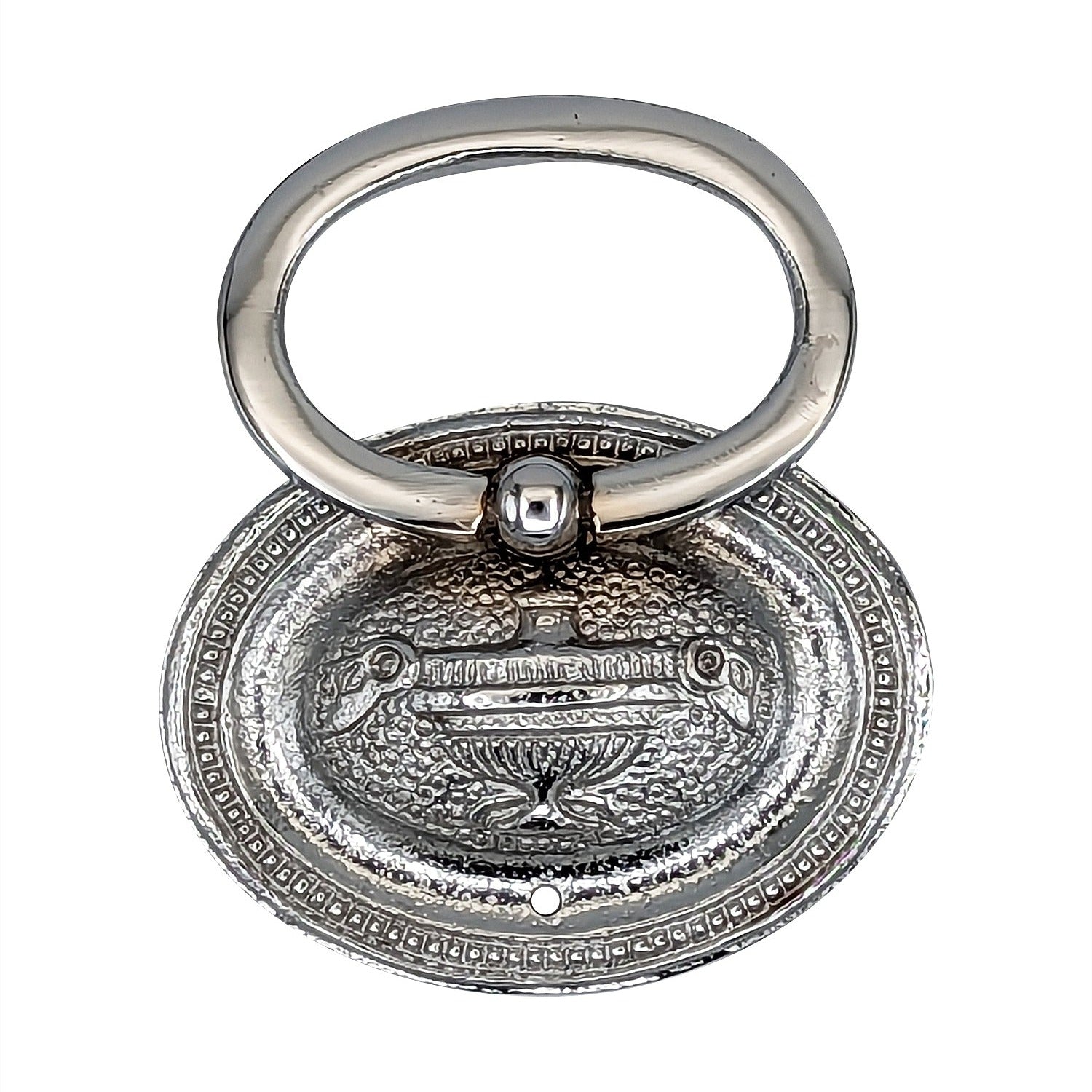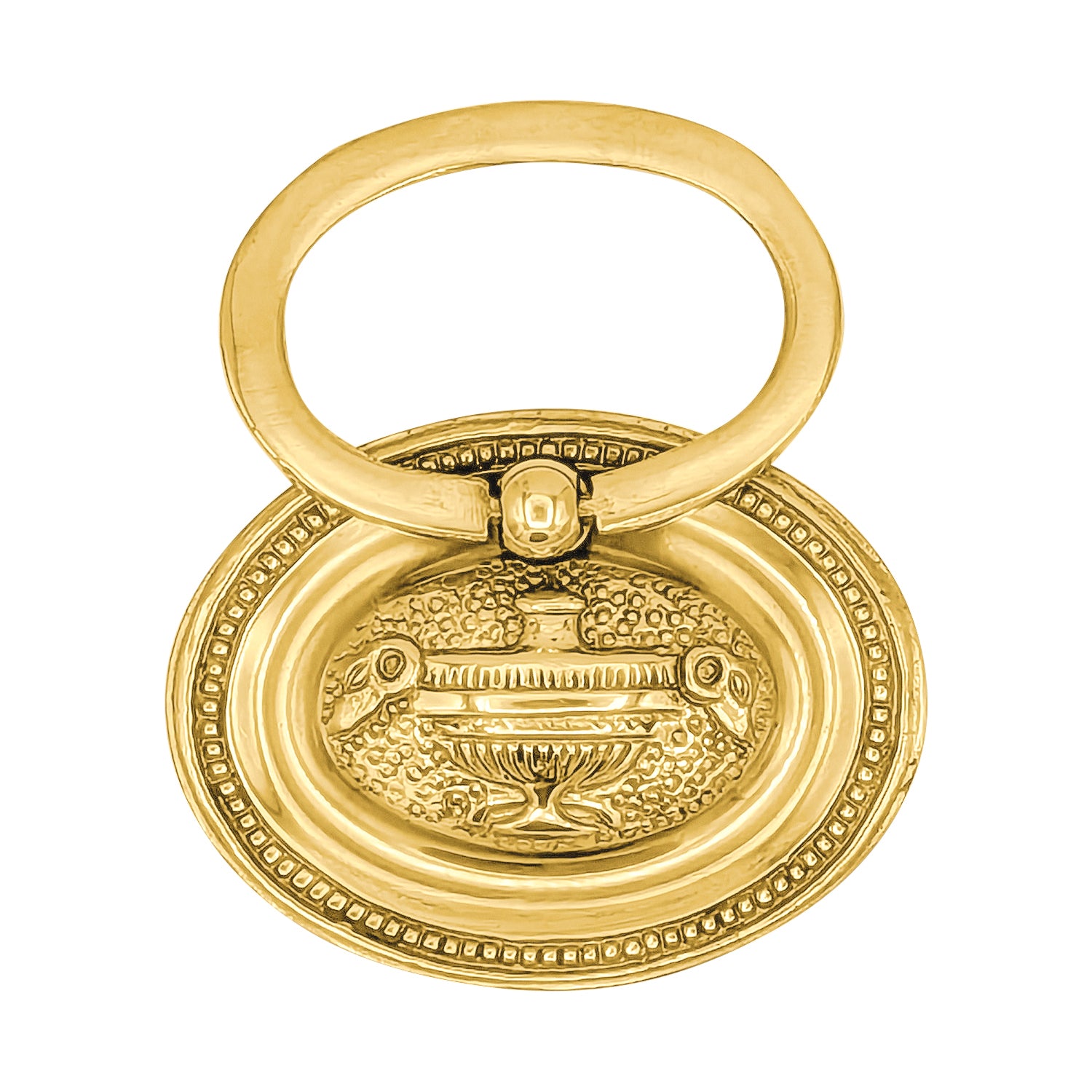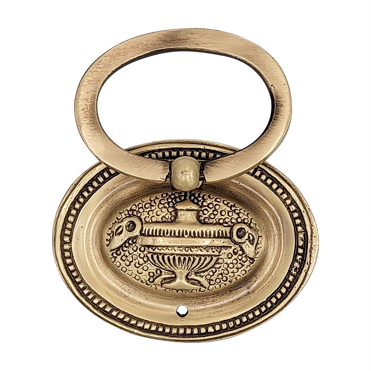 This ring pull measures 2 7/8 inches long and 2 1/8 inches tall. Comes complete with one rear mount machine screw. This oval bail pull is made in the Hepplewhite and Federal (Federalist) style and it is available in several finishes. Comes complete with mounting hardware.